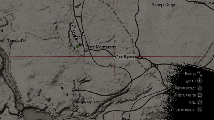Скачем к посту Мансанита (смотри скриншот). Берем дорогу за центр, с небольшим радиусом катаемся на лошади по местности и крутим камеру туда сюда - высматривая цель.